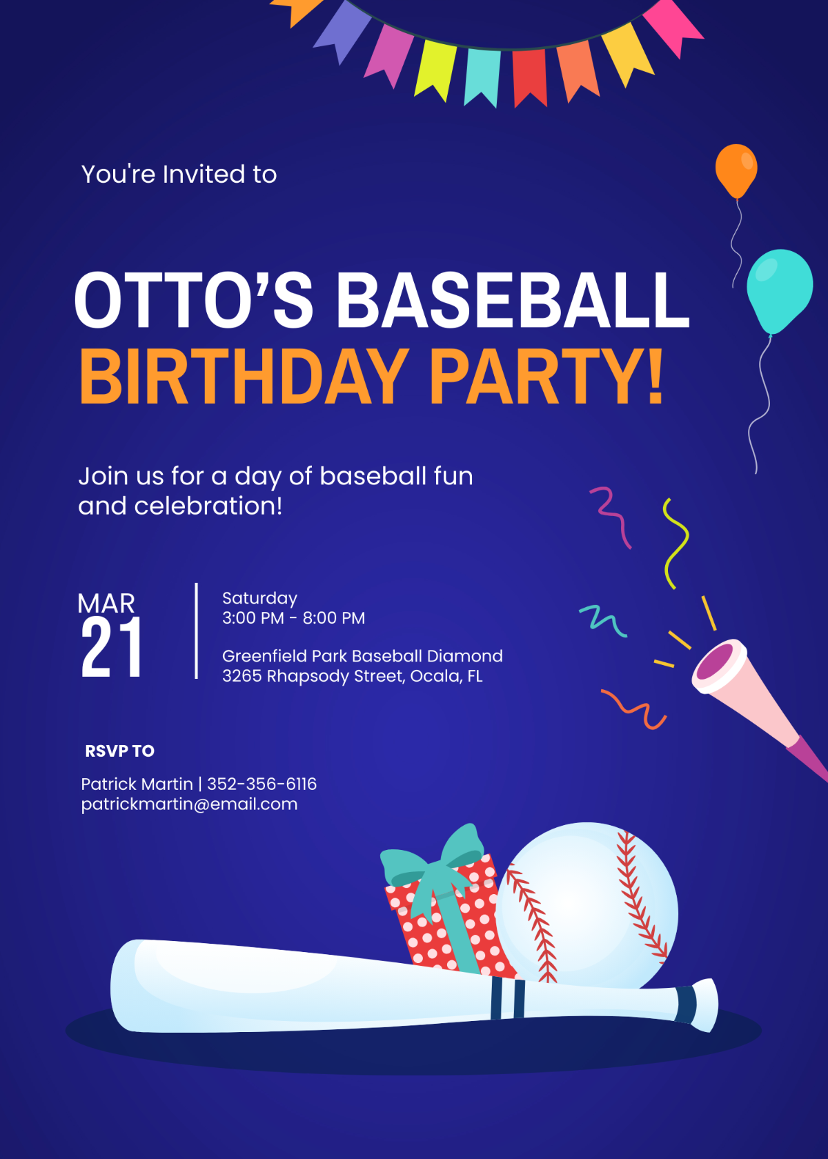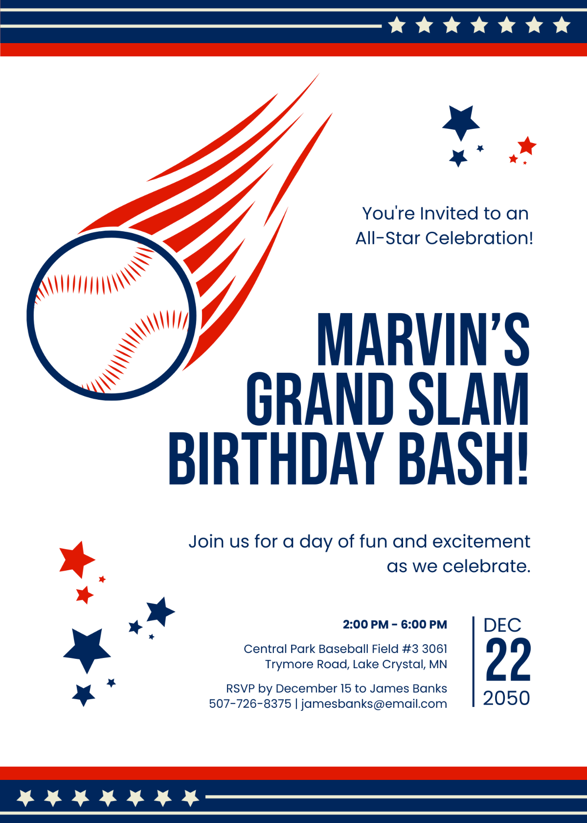 From the moment your guests receive their invitations, they’ll be counting down the days until they can step up to the plate and join in on the fun. With its customizable fields for date, time, and location, this template makes it easy to personalize your invitations and make sure all of your guests know exactly when and where the party will be taking place.