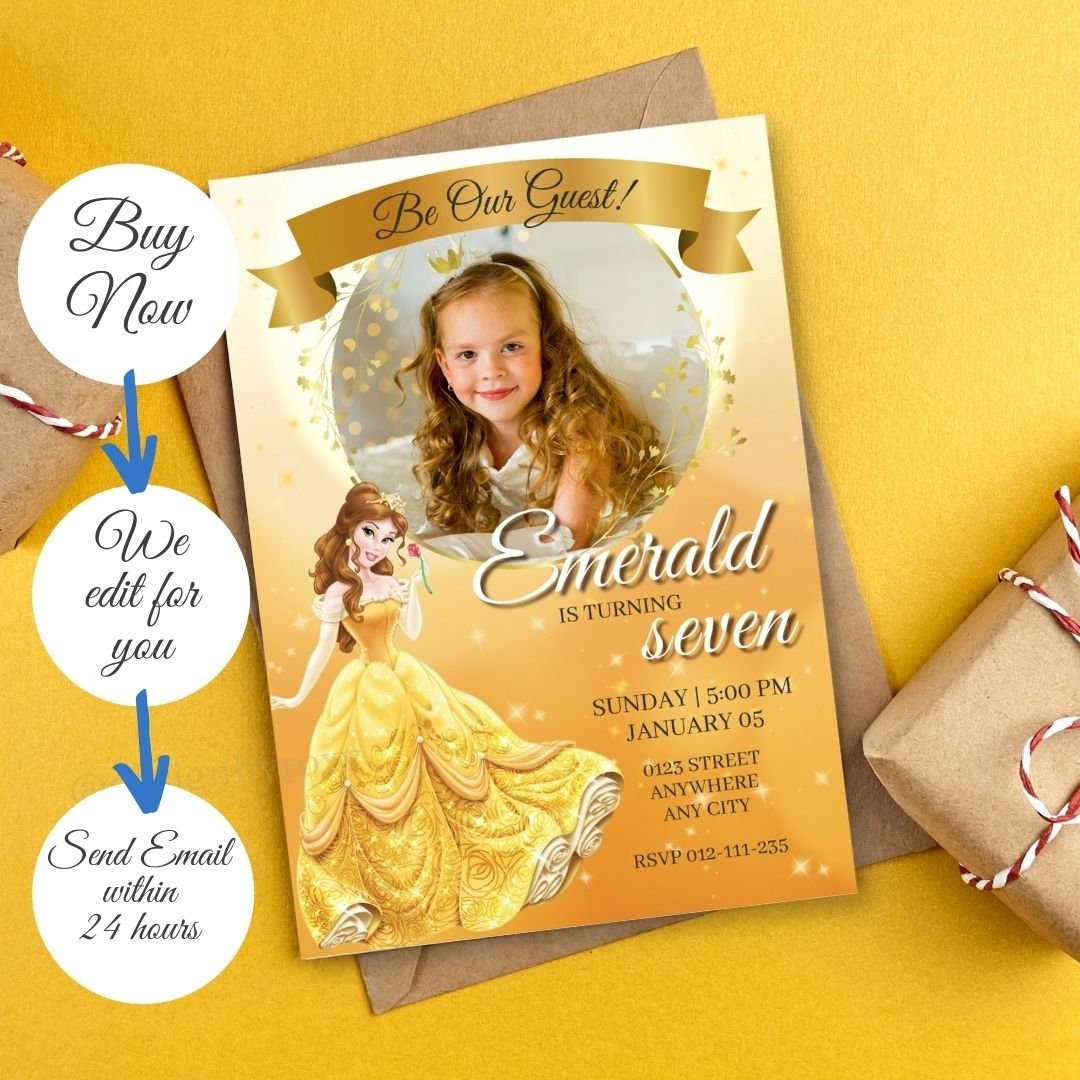 For a personal touch, consider adding a photo of your child dressed as Belle or a custom message that reflects the enchanting theme of the party. This will not only make the invitation more special but also create anticipation for the magical celebration to come.