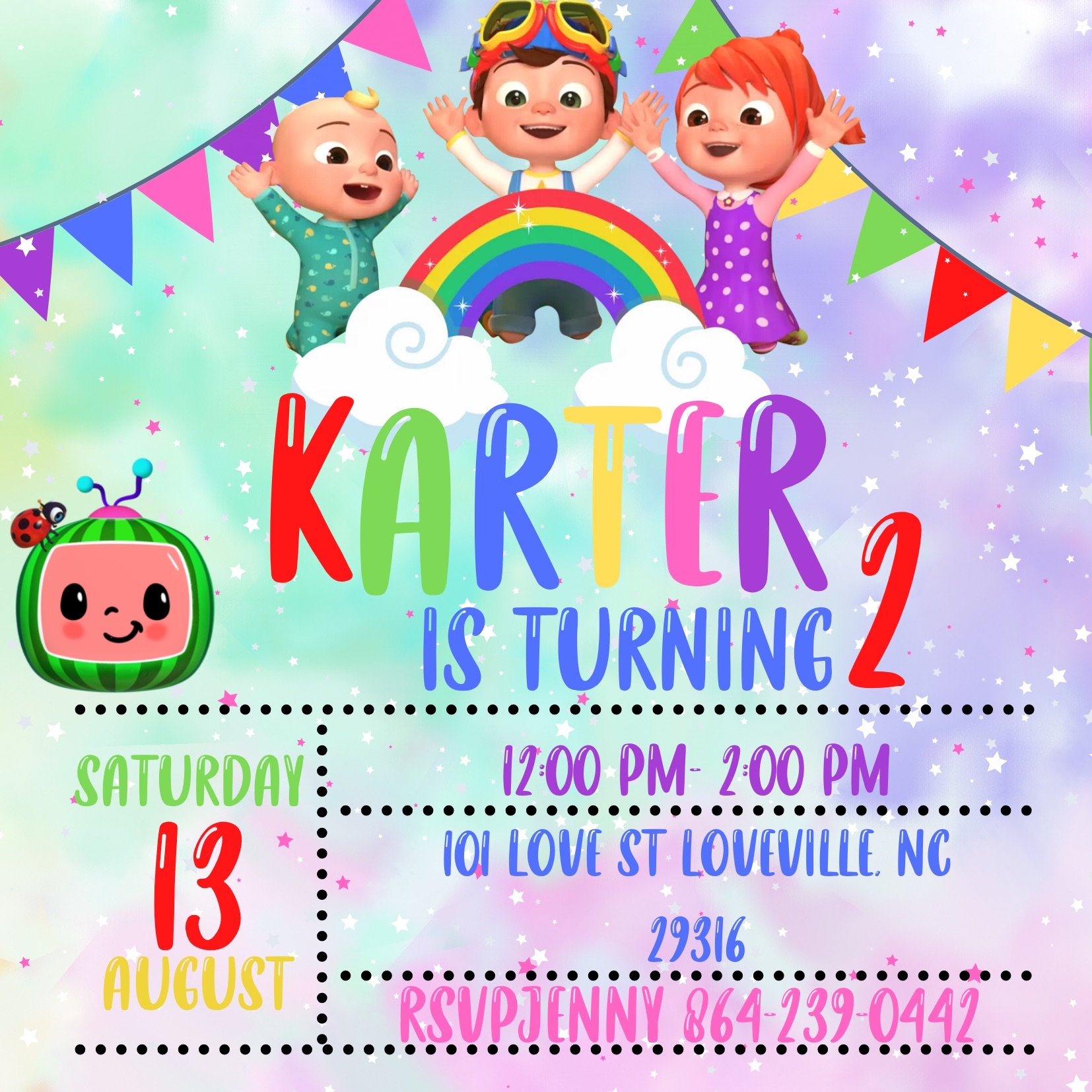 Don’t forget to include all the important details on your invitation card, such as the date, time, location, RSVP information, and any special instructions for the guests. You can also add a personal touch by including a sweet message or a fun rhyme that ties in with the Cocomelon theme.