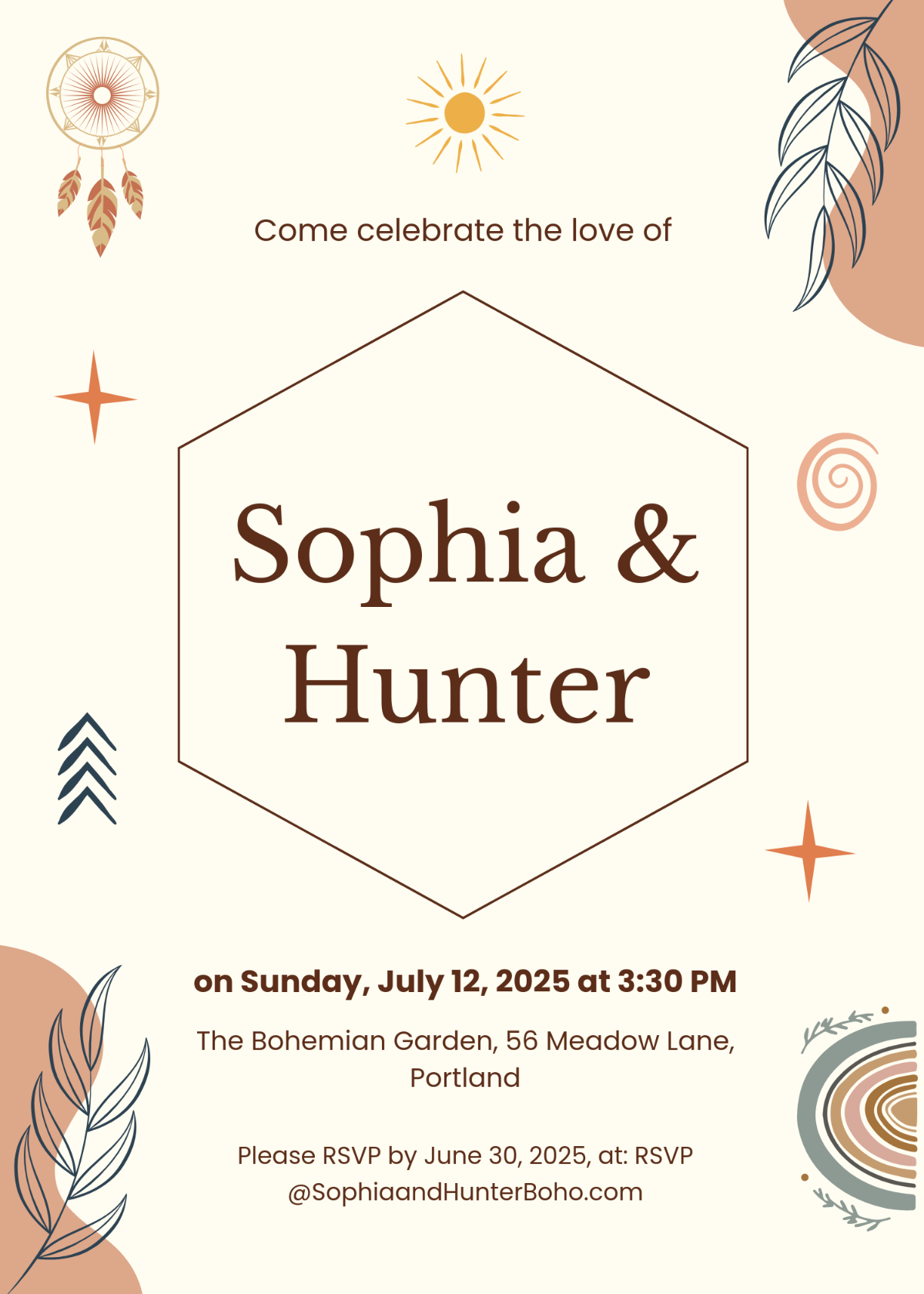 Our boho chic invitation templates are fully customizable, allowing you to add your own text, images, and colors to create a personalized invitation that reflects your unique style. Whether you’re hosting a boho wedding, baby shower, birthday party, or any other event, our templates are perfect for any occasion.