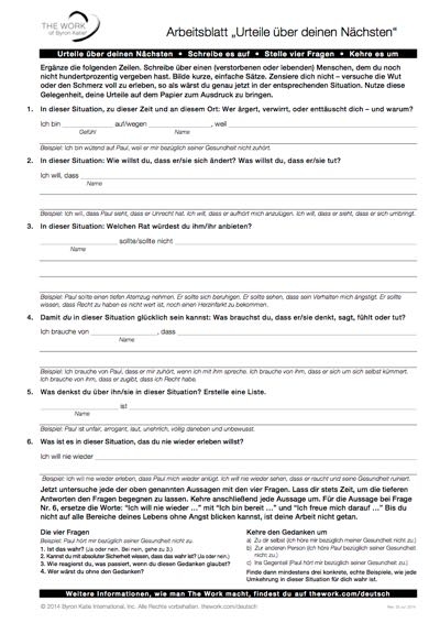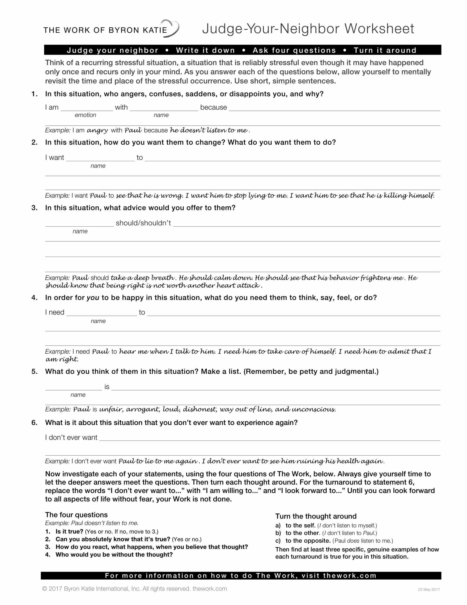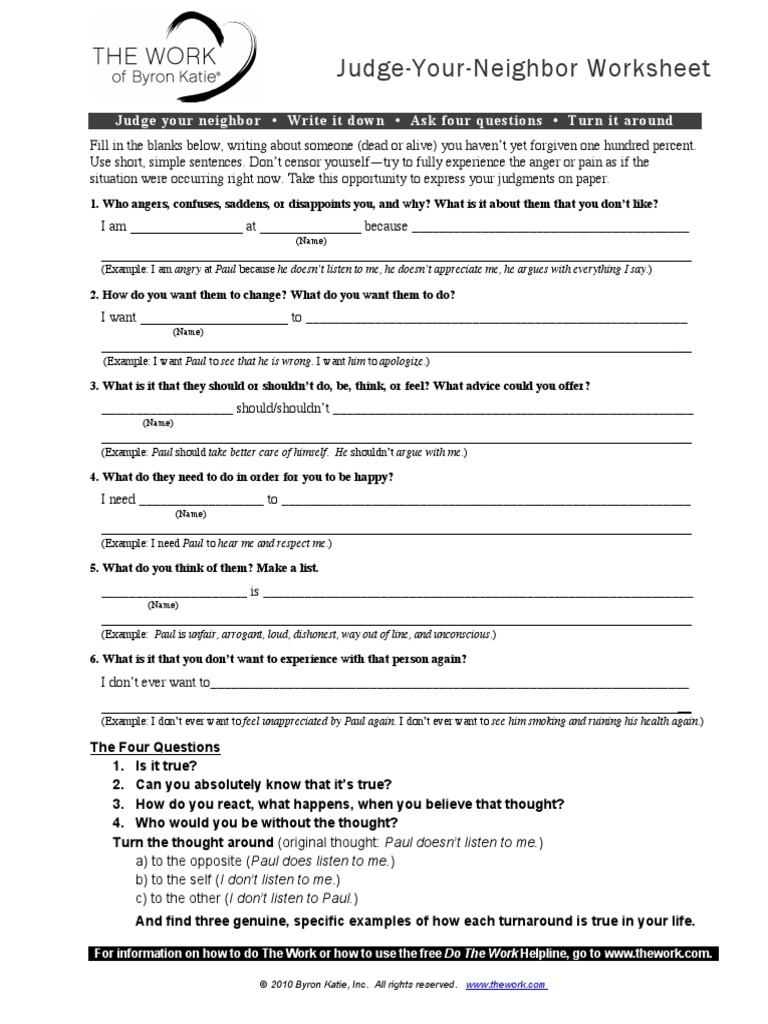 Through The Work worksheet, Byron Katie encourages individuals to identify and question the thoughts that cause them suffering. By examining these beliefs and challenging their validity, people can free themselves from the grip of negative thinking patterns and find a sense of liberation and inner peace.