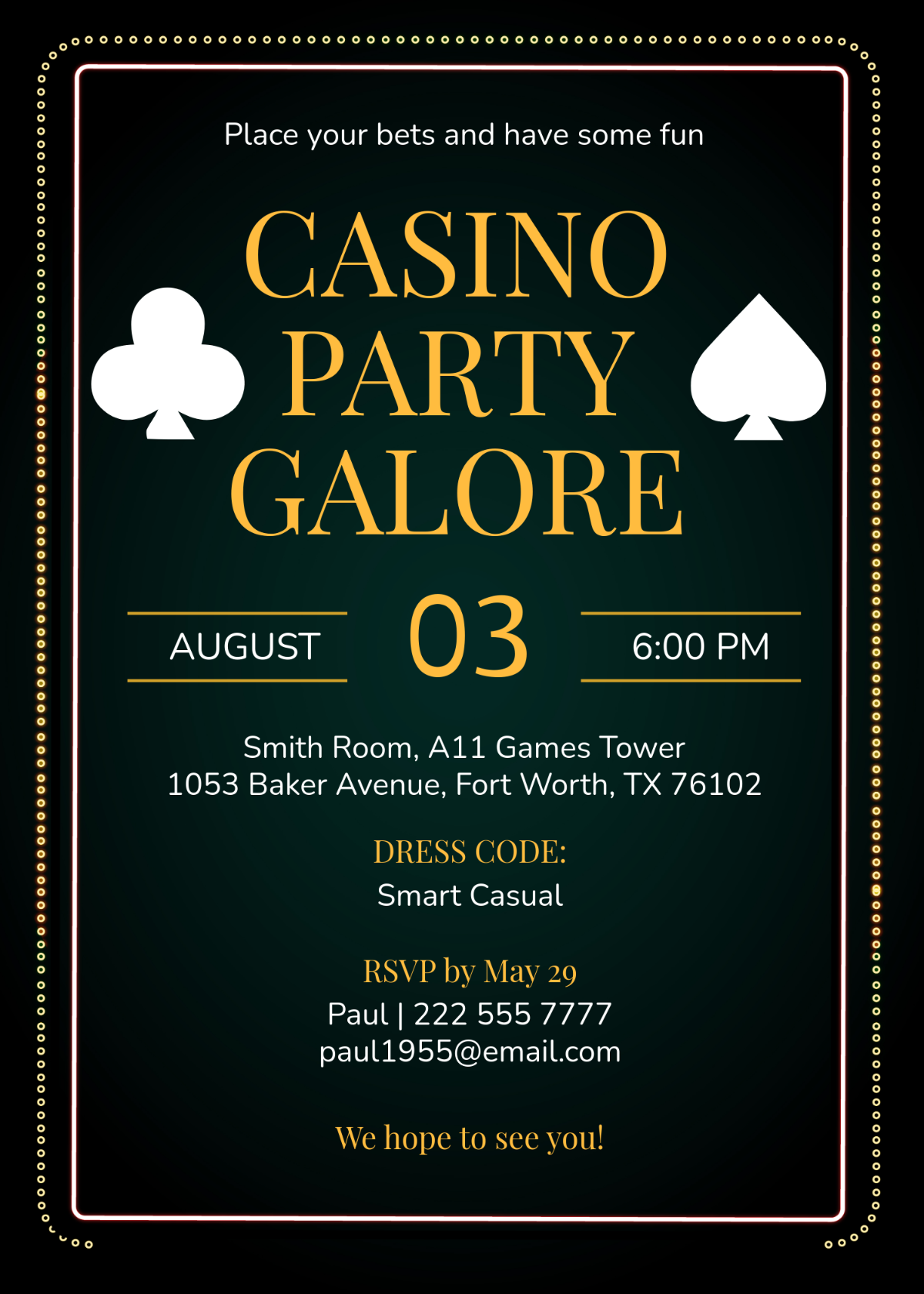 Our casino invitation templates feature a variety of designs, from classic card suits and casino chips to glamorous Las Vegas lights and slot machines. You can easily customize the text, colors, and fonts to suit your event theme and personal style. Simply download the template, edit it with your party details, and print as many copies as you need.