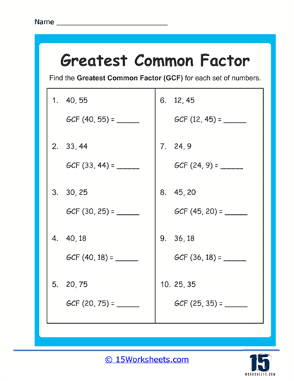 Another type of question on a common factors worksheet may involve finding the greatest common factor (GCF) of a set of numbers. The GCF is the largest number that divides evenly into all the numbers in the set. This exercise helps students practice identifying the highest common factor among a group of numbers, which is particularly useful in simplifying fractions.