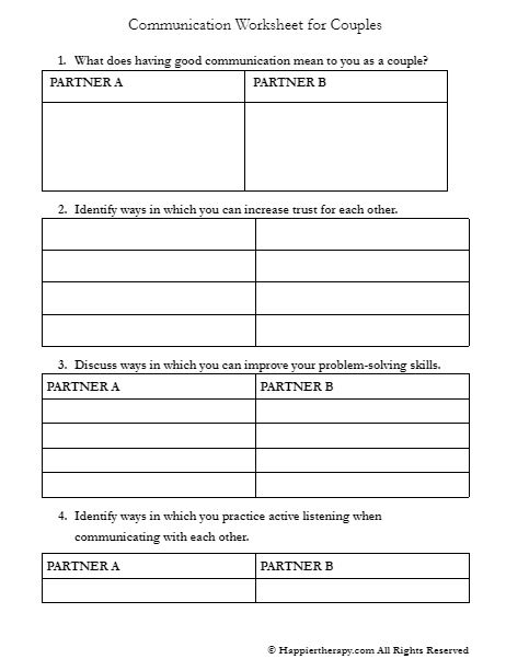 One common type of worksheet focuses on active listening skills. This involves techniques such as paraphrasing, reflecting, and summarizing what your partner says to ensure that you understand their perspective. By practicing active listening, couples can avoid misunderstandings and show empathy towards each other.