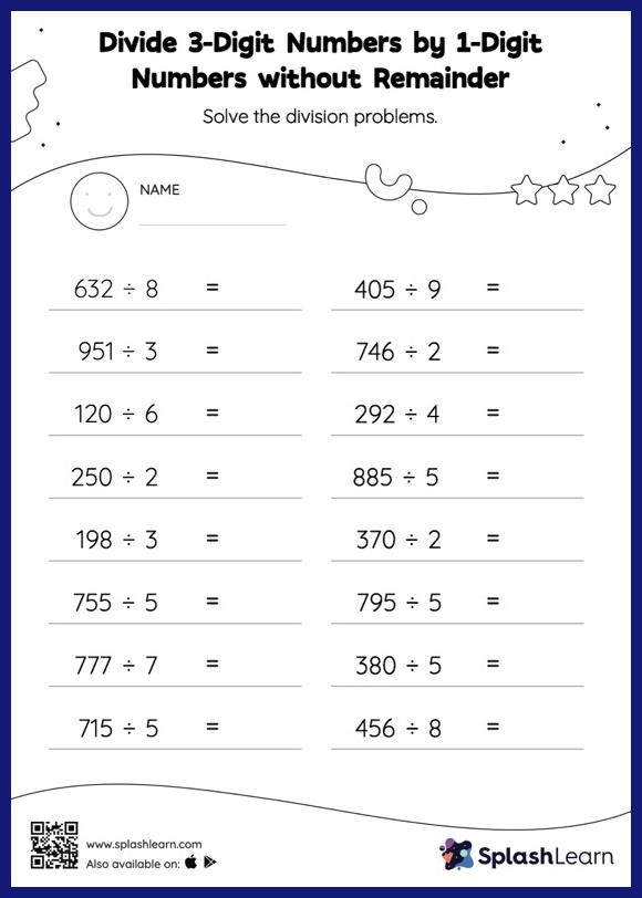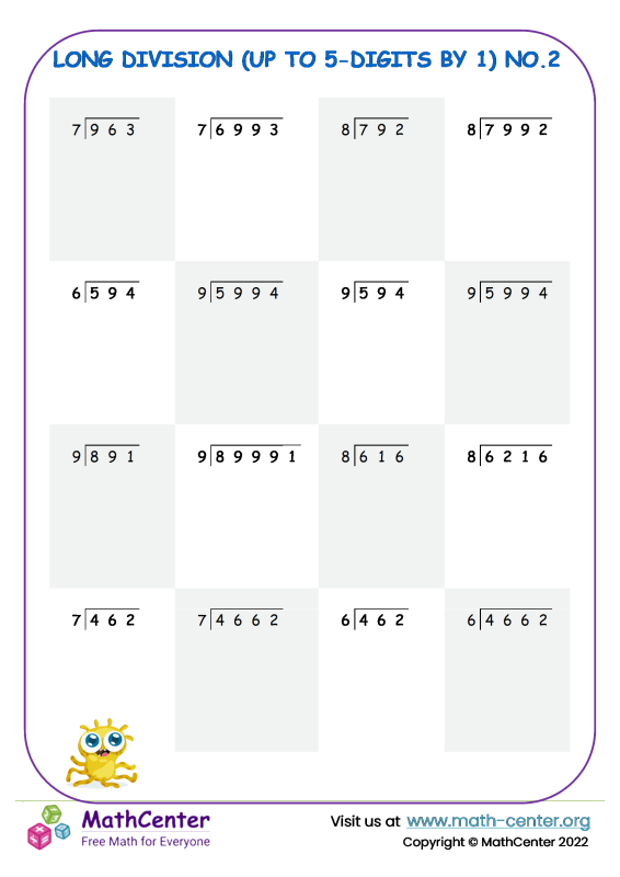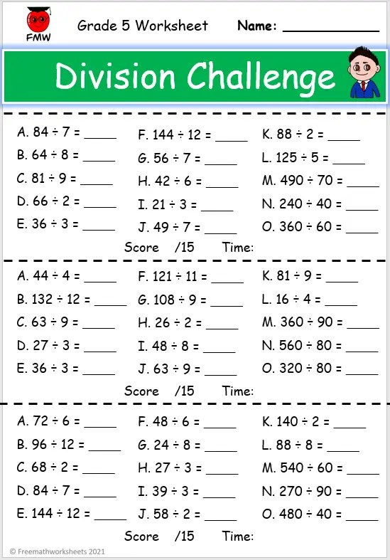 As students advance in their math skills, they begin to work on more complex division problems involving larger numbers. Division for 5th graders worksheets often include problems that require students to divide multi-digit numbers, understand remainders, and solve word problems using division. These worksheets help students build their problem-solving skills and improve their overall math proficiency.