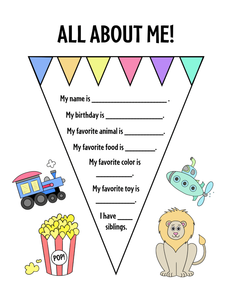 1. Preschool Play and Learn offers a cute and colorful “All About Me” worksheet that includes sections for children to draw pictures of themselves, their family, and their favorite things.