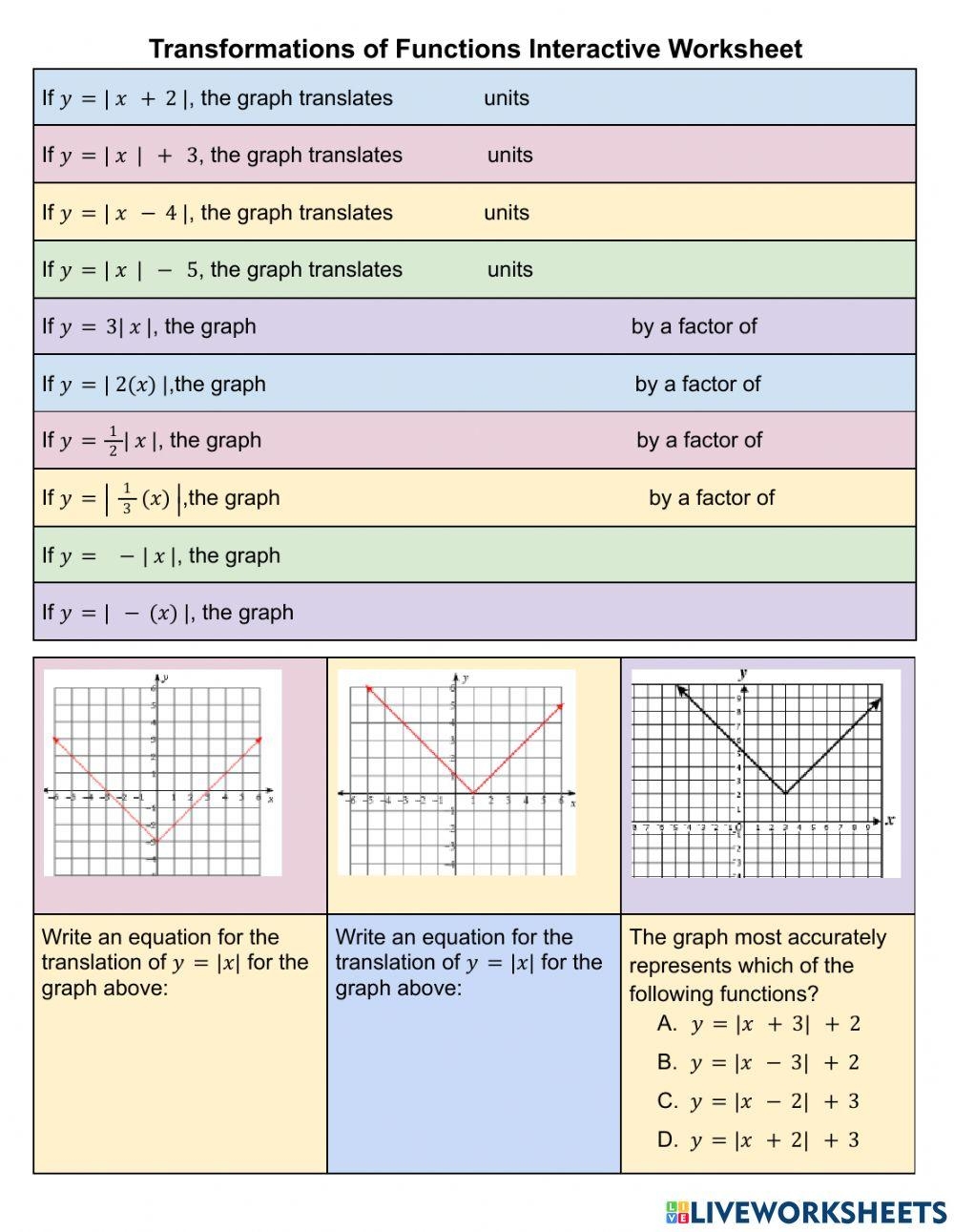 A functions and transformations worksheet is a valuable tool for practicing and mastering these concepts. It typically consists of a series of problems that require students to apply their knowledge of functions and transformations to solve various mathematical problems. These worksheets can help reinforce the concepts learned in class and provide students with additional practice to improve their skills.