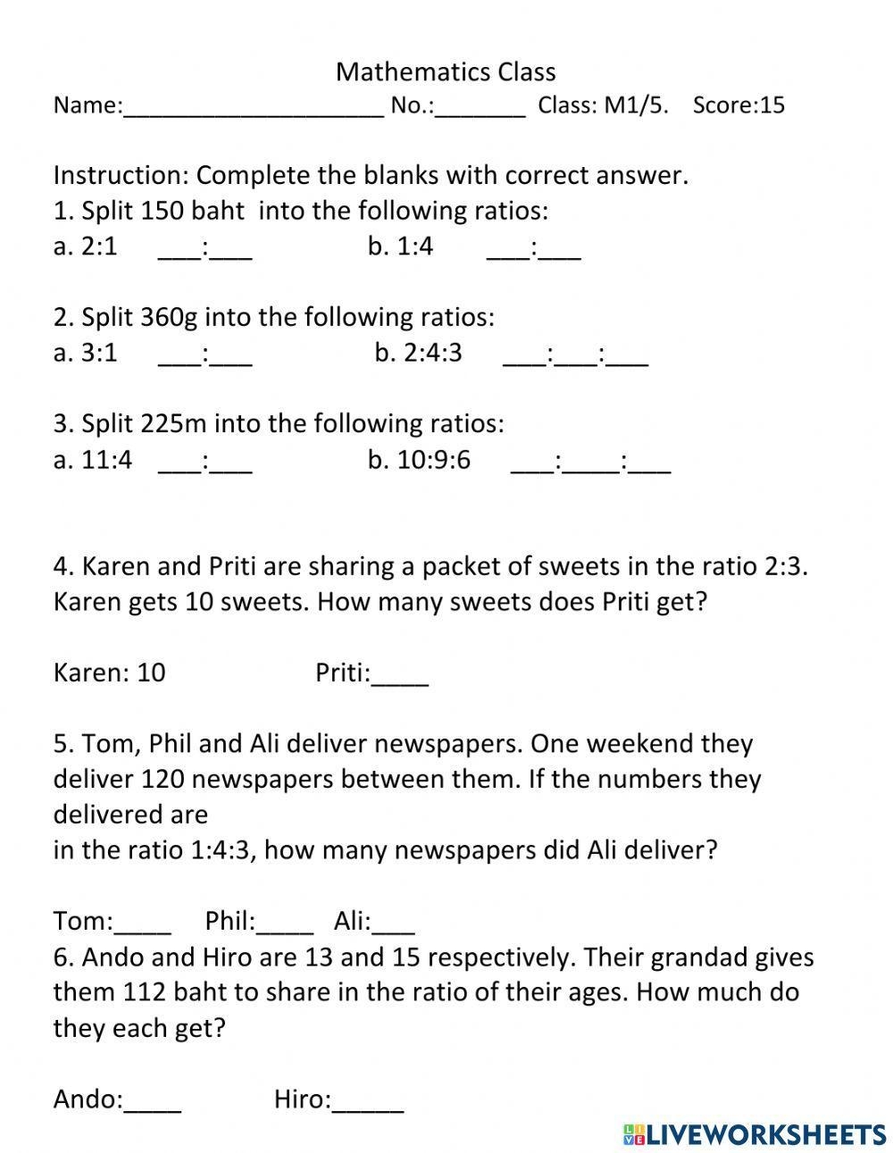 Another type of ratio worksheet for grade 6 students involves using ratios to solve word problems. Students are presented with a scenario and must use their knowledge of ratios to solve the problem. This type of worksheet helps students see the real-world applications of ratios and how they can be used in everyday situations.