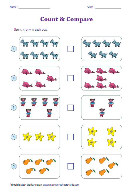 Greater than less than worksheets for kindergarten often feature visual aids such as pictures of animals, fruits, or objects to make the concepts more relatable and easier for young children to understand. Children are asked to count the number of each item and then compare them using the symbols for greater than (>), less than (<), or equal to (=).