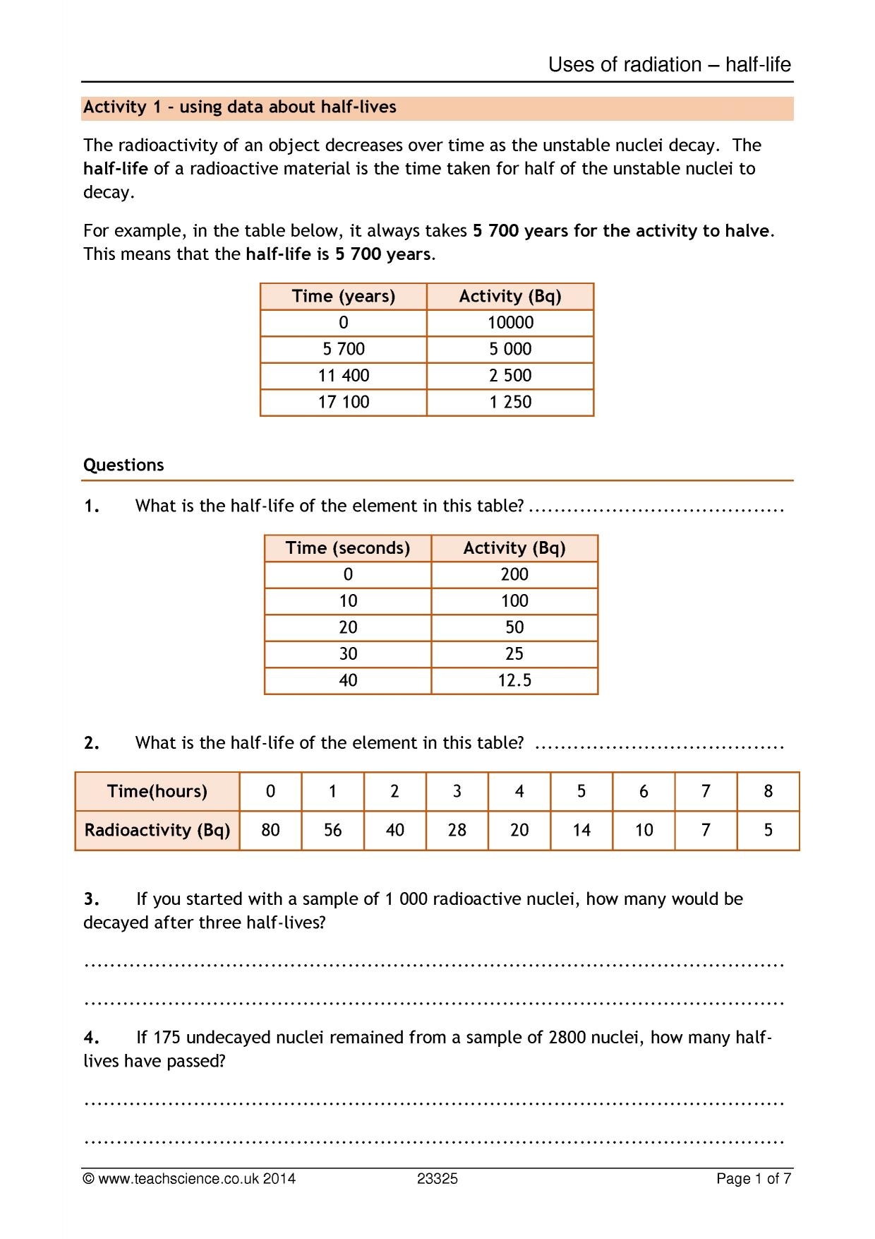 Half Life Worksheet Radiation KS4 Physics Teachit Worksheets Library