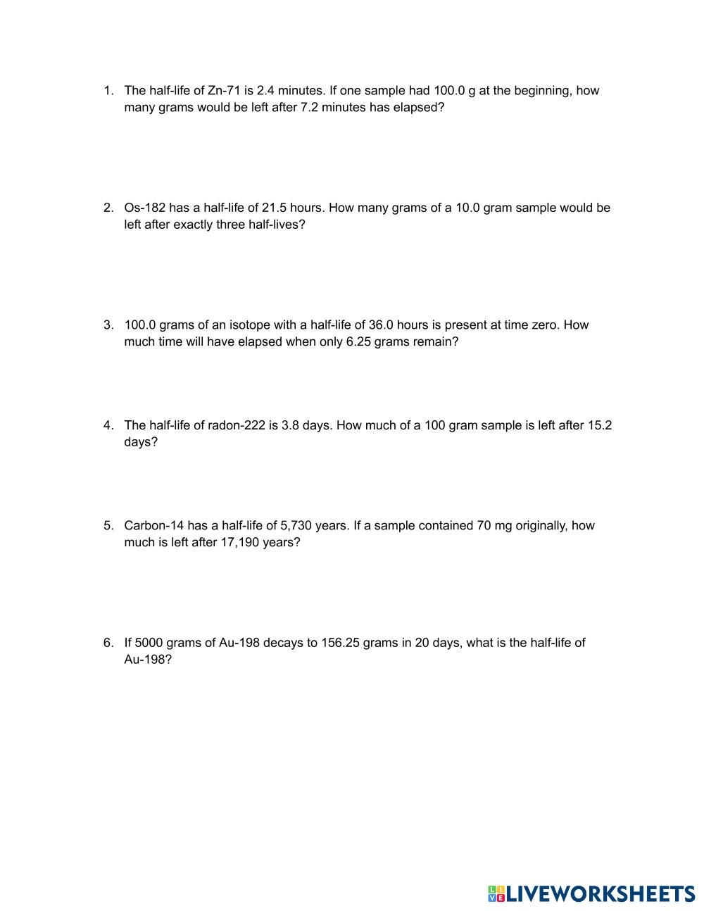 Another type of problem found in half-life worksheets involves determining the amount of time it takes for a substance to decay to a certain level. Students are given the initial amount of the substance and the percentage of decay they want to achieve, and they must calculate the time it will take for the substance to reach that level of decay. This type of problem helps students understand the relationship between half-life and the rate of decay of a substance.