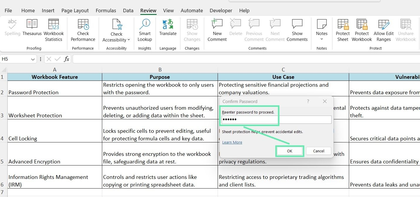 6. Click “OK” to apply the password protection to your Excel worksheet.