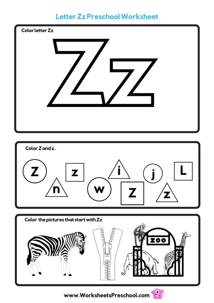 Other worksheets may include activities such as coloring pictures of objects that start with the letter Z, identifying words that begin with Z, and completing simple puzzles or mazes featuring the letter Z. These activities make learning about the letter Z fun and engaging for young children.