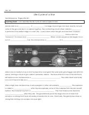 Life Cycle of Stars Worksheet