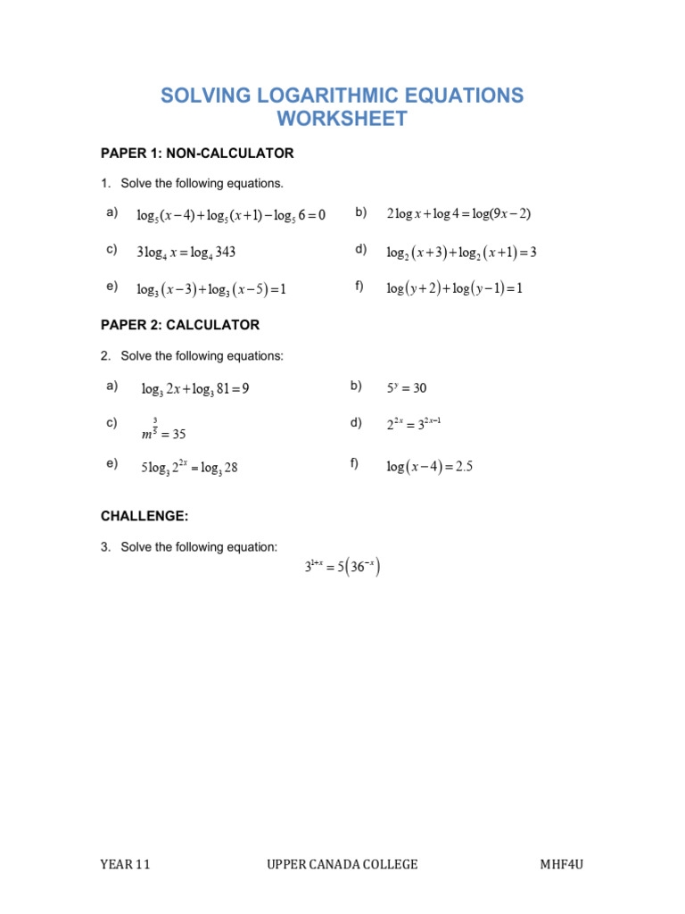 Log Equations Worksheet