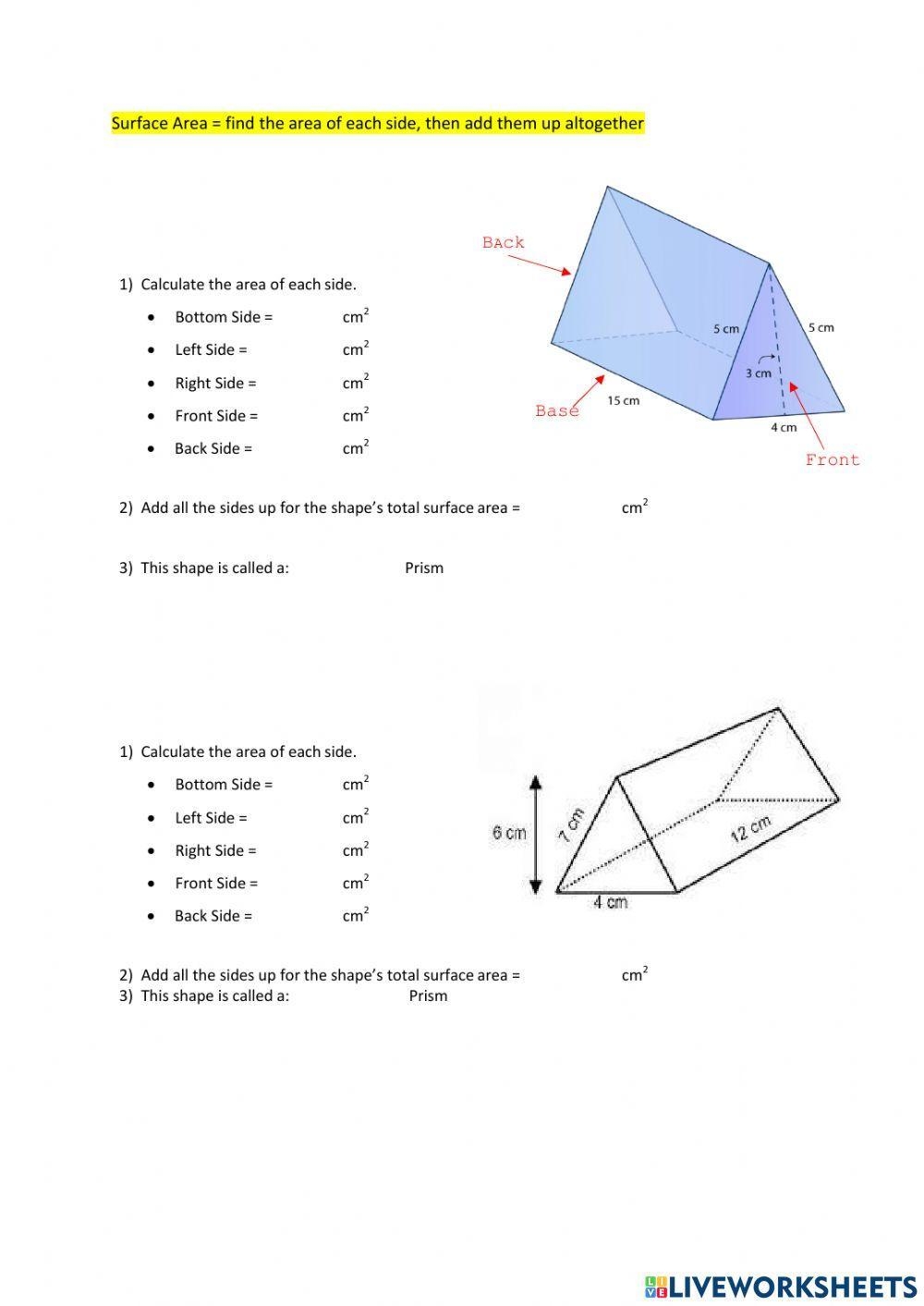 Surface Area Of Triangular And Pentagonal Prism Worksheet Live
