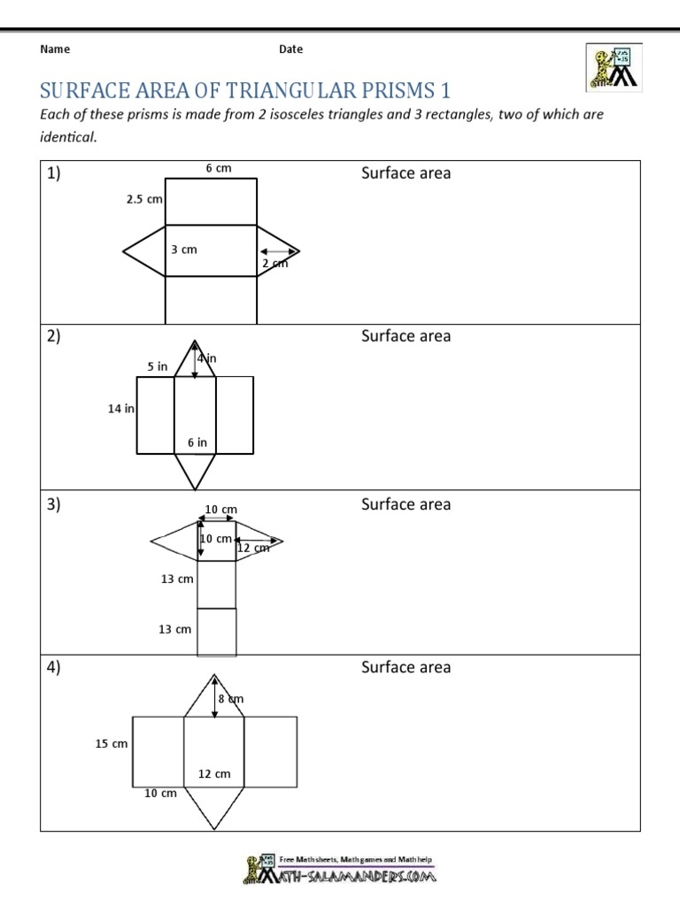 Understanding the surface area of a triangular prism is essential in geometry. It involves calculating the total area that covers the outside of the prism. This worksheet is designed to help students practice and master this concept through various exercises and problems.