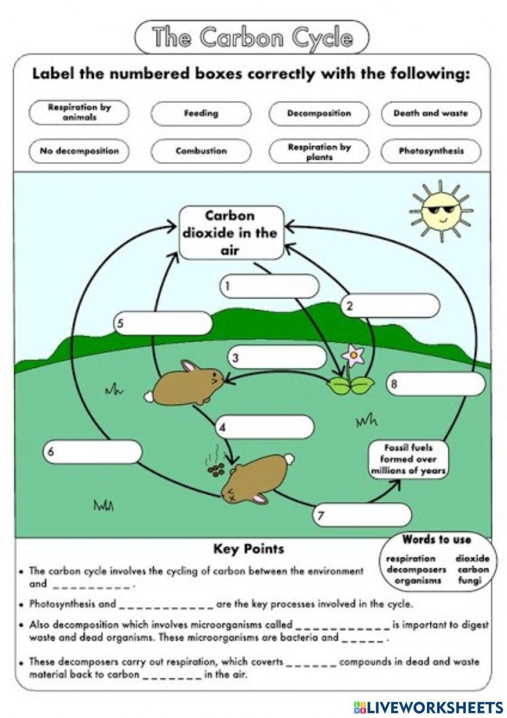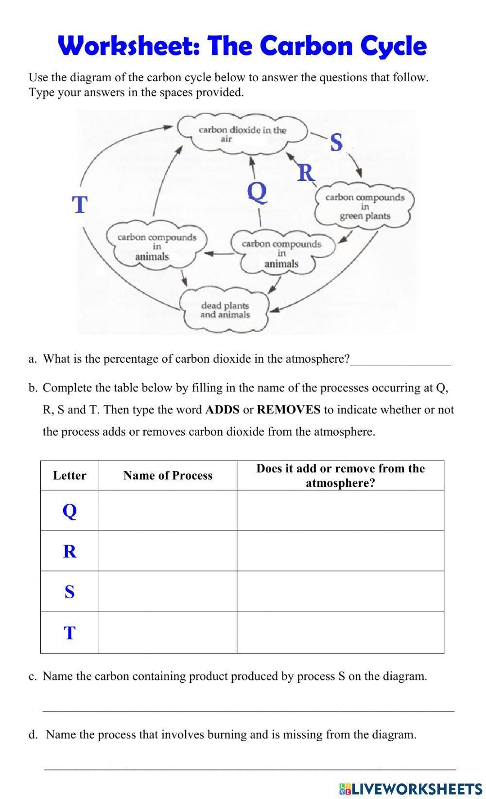 When completing a carbon cycle worksheet, students are typically asked to identify the different components of the carbon cycle, such as photosynthesis, respiration, decomposition, and combustion. They may also be required to draw diagrams or answer questions about the role of each component in the cycle. Through these activities, students can gain a deeper understanding of how carbon is cycled through the Earth.