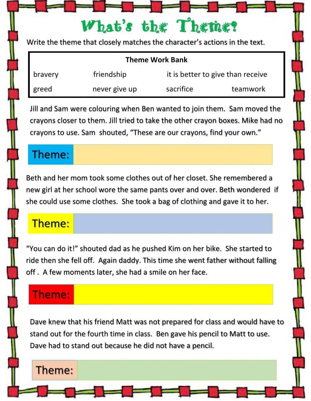 Furthermore, theme worksheets can be used as assessment tools to gauge students’ comprehension and interpretation of literary themes. Teachers can use students’ responses to theme worksheet questions to assess their critical thinking skills, ability to make inferences, and capacity to analyze textual evidence. By incorporating theme worksheets into their lesson plans, educators can help students develop a deeper appreciation for the complexities of literature.