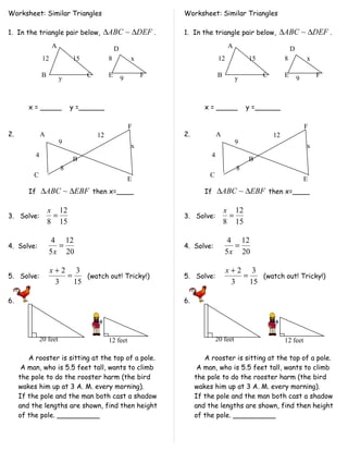 A triangle similarity worksheet typically consists of a series of geometric problems that require students to determine if two triangles are similar and to find missing sides or angles. These worksheets can be a valuable tool for students to practice their skills and test their understanding of triangle similarity.