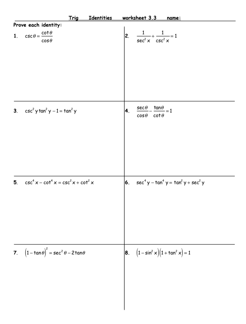 Furthermore, working through a worksheet allows students to develop their algebraic skills and logical reasoning. Proving trigonometric identities often requires students to apply algebraic techniques such as factoring, simplifying expressions, and manipulating equations, which can help strengthen their overall mathematical abilities.