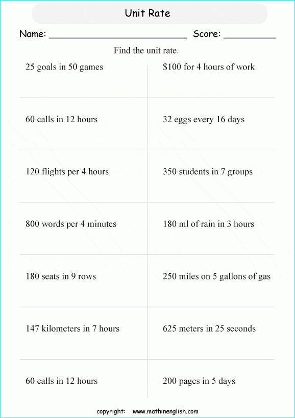One common type of unit rate worksheet involves calculating the unit rate of a given quantity, such as the cost per item or the speed per hour. Students are required to analyze the given information, set up the appropriate ratio, and solve for the unit rate. These exercises help students build their problem-solving skills and develop a deeper understanding of unit rates.