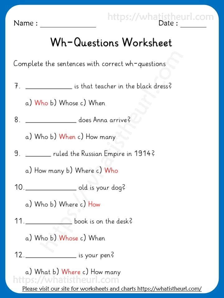One common type of exercise found in a WH questions worksheet is the fill-in-the-blank activity. In this exercise, students are presented with a sentence and must choose the appropriate WH question word to complete the question. For example, a sentence may read, “She is going to the park.” Students would then need to form a question using the word “where” to ask, “Where is she going?” This type of activity helps students practice forming questions and understanding the context in which different WH question words are used.