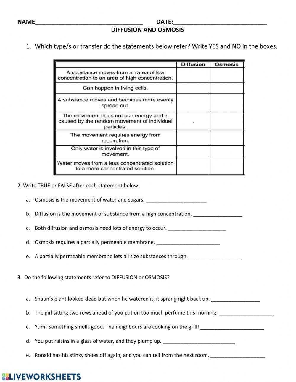 Understanding the concepts of osmosis and diffusion is crucial in the field of biology. These processes play a vital role in the movement of molecules across cell membranes, maintaining the balance and functioning of living organisms. By conducting a worksheet on osmosis and diffusion, students can deepen their understanding of these fundamental biological processes.