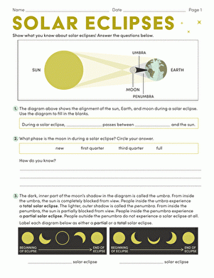 Here are a few activities that can be included in a worksheet on solar eclipses:
