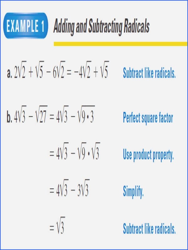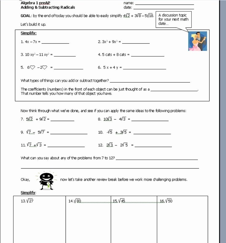 By practicing with a worksheet, students can become more comfortable with radicals and gain confidence in their ability to work with them. This type of worksheet typically includes a variety of problems that require students to add or subtract radicals, simplify the resulting expression, and sometimes even rationalize the denominator.