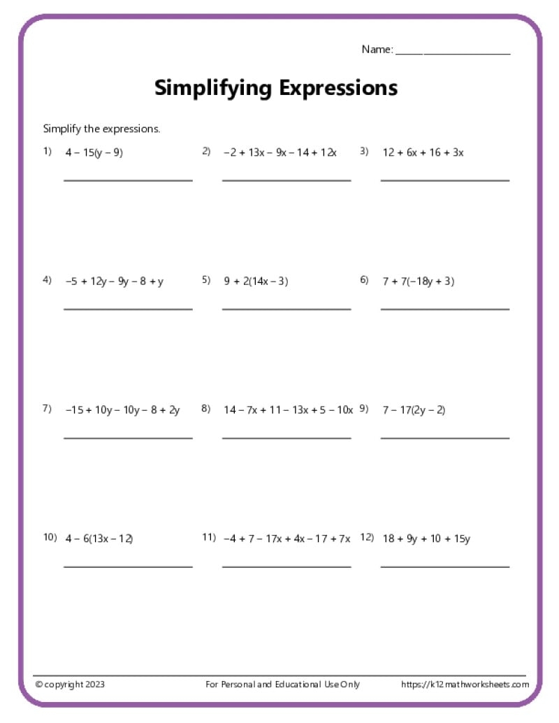 These worksheets typically present students with a variety of algebraic expressions that they need to simplify. This may involve combining terms with the same variables, distributing coefficients, and applying the rules of exponents. By working through these problems, students can develop a better understanding of algebraic equations and improve their problem-solving skills.