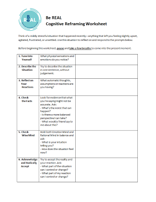 A cognitive reframing worksheet is a structured tool that guides individuals through the process of identifying and reframing their thoughts. This worksheet typically includes prompts and exercises to help individuals challenge their negative beliefs and replace them with more balanced and constructive ones.