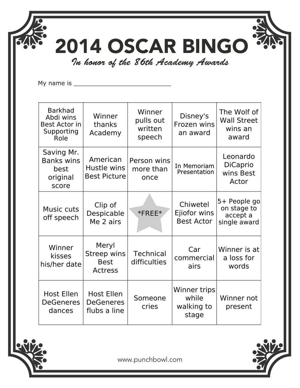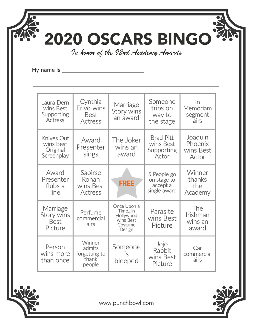 Oscar Bingo Cards Printable