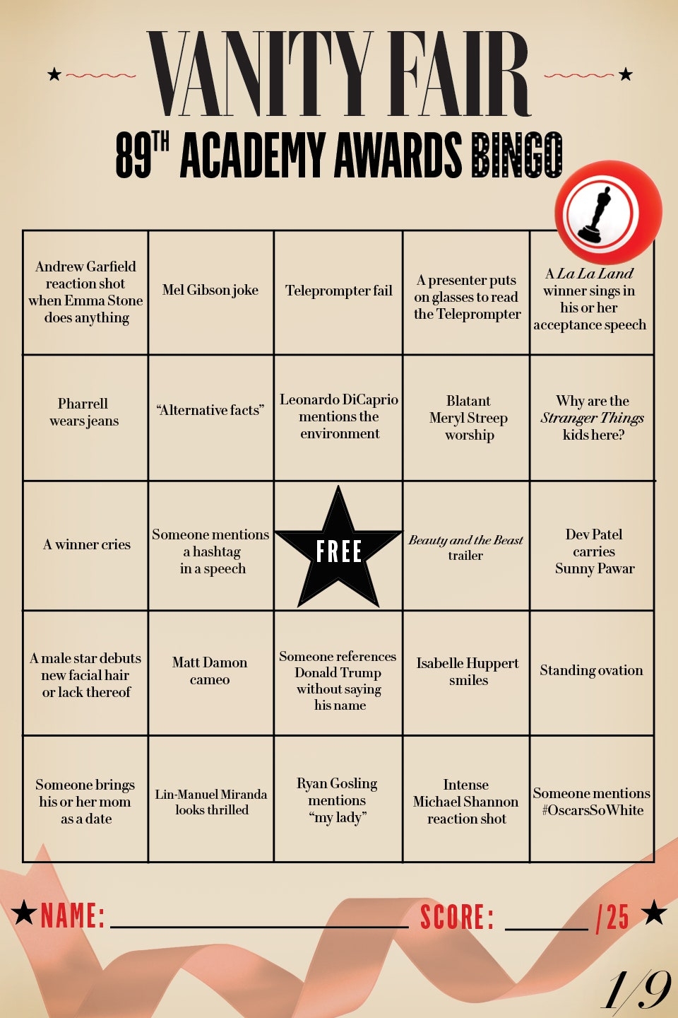 As the awards show progresses, have your guests mark off the squares on their bingo cards as they spot the corresponding events on screen. The first person to get a bingo can win a prize, or you can continue playing until someone fills their entire card for the ultimate Oscar Bingo victory.