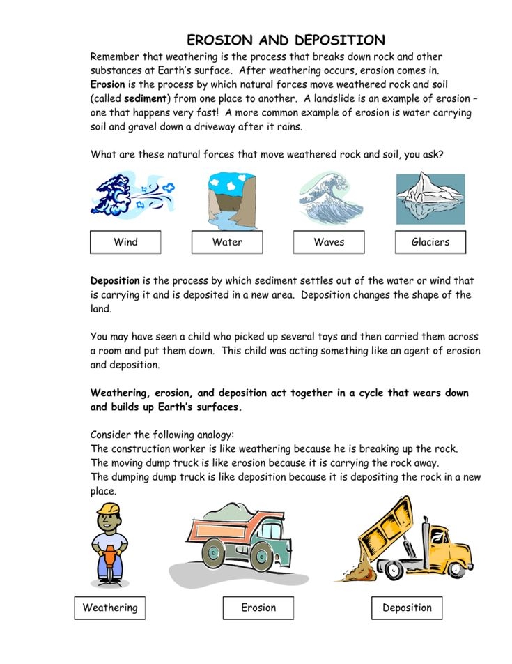 Erosion is the movement of weathered material from one place to another. This can happen through the action of wind, water, or ice. Worksheets on erosion may involve experiments where students observe the effects of water flow on different types of soil or rock samples.
