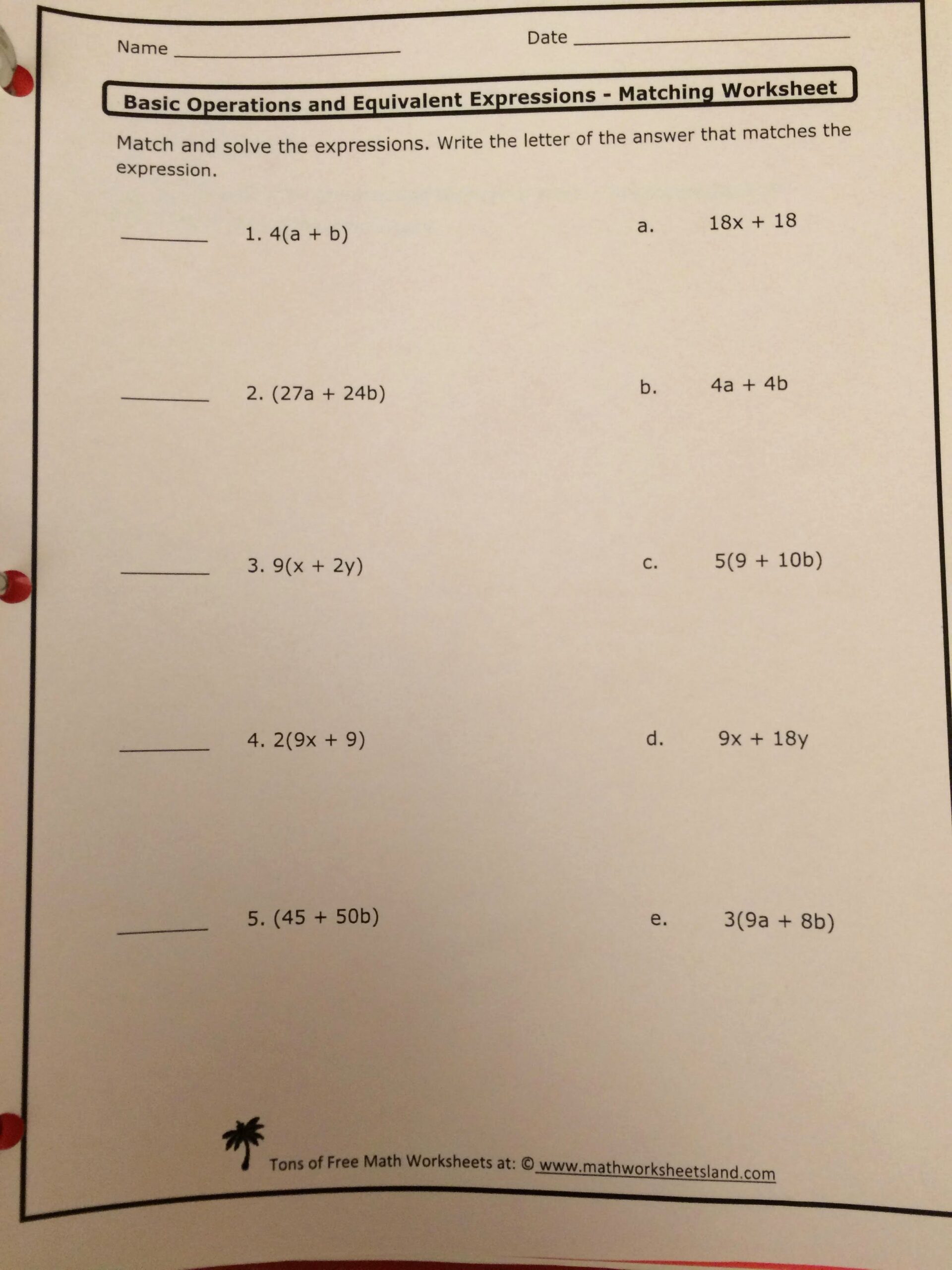 Writing Equivalent Expressions Using Properties Worksheet